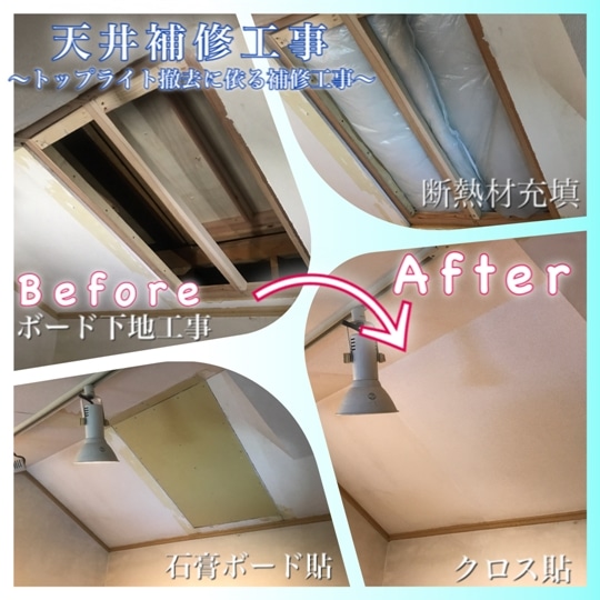 屋根のトップライトを撤去いたしましたが、 ロフトの天井補修工事が残っています。 天井の穴の下地組から断熱材、ボード貼、パテ処理と工事をして クロスで仕上げるのですが、 クロスって、3年程度で色合いや模様が替わるんです。 […]