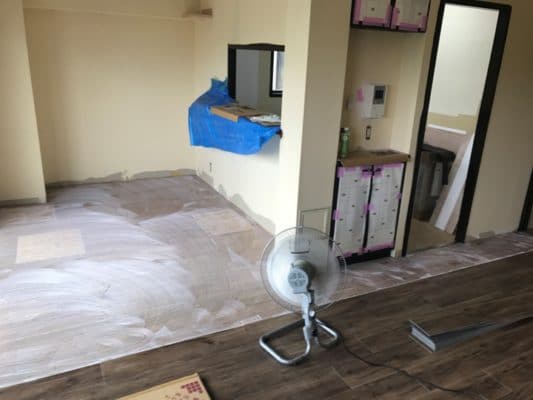 床:既存フローリングの上に、木目調のフロアタイルを張っています。フローリングより金額を抑える事が出来!種類もたくさんあるのがお勧めです。施工も早く工事中の音も静かでこれまた、現場的にもお勧めです。